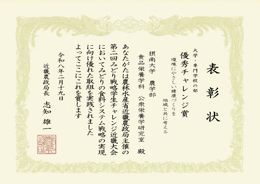 公衆栄養学研究室では食品ロス削減を研究テーマとし、外食料理の持ち帰りに関する調査や「うさミンカフェ」での食品ロス削減を体現する取り組みなどを行ってきました。それら「環境にやさしい健康づくりを地域と共に考える」活動が農林水産省近畿農政局主催の第2回みどり戦略学生チャレンジ近畿大会において評価され、優秀チャレンジ賞を受賞しました。