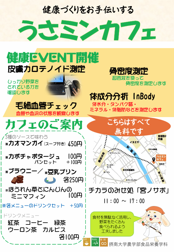 今後も、うさミンカフェを大学での研究成果を地域に還元するサテライトとして、地域の方々の健康増進に役立てていきたいと考えています。