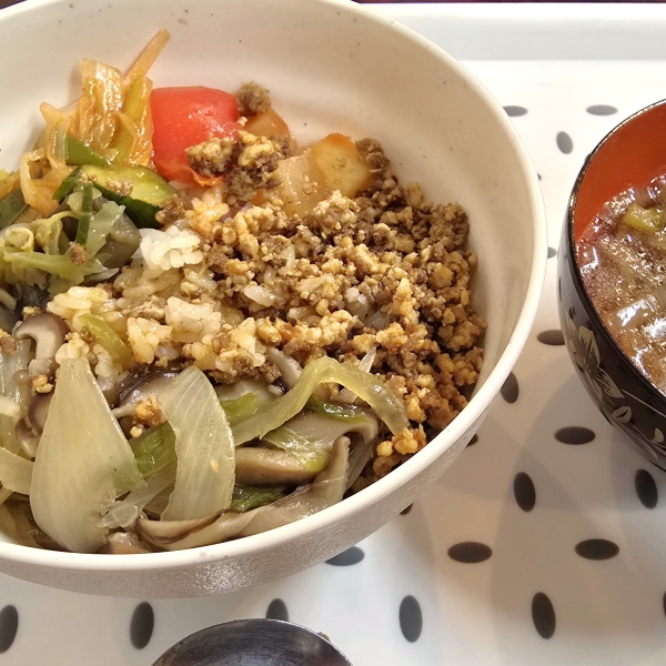 廃棄処分となった野菜を活用し、野菜たっぷりの「ビビンバ」と玉ねぎの皮で煮だした「オニオンスープ」を作りました。